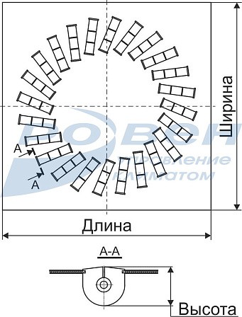 В стандартном исполнении в квадратных и круглых диффузорах типоразмеров 300/8, 400/12, 400/16, 450/16, 450/20, 500/16, 500/24 и 600/24 установка направляющих лопаток формирует на выходе вихрь, вращающийся против часовой стрелки. В типоразмере 600x48 направляющие лопатки наружного ряда формируют вихрь против часовой стрелки, а внутреннего ряда – вихрь по часовой стрелке.